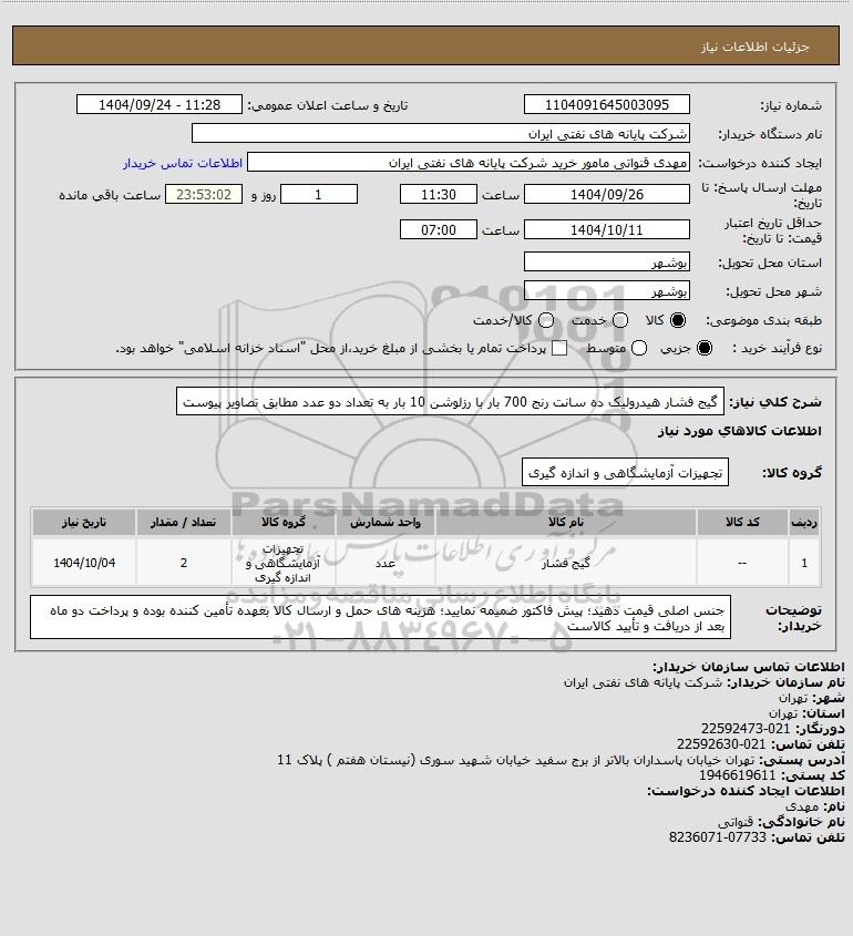 شرح کلی نیاز: گیج فشار هیدرولیک ده سانت رنج 700 بار با رزلوشن 10 بار به تعداد دو عدد مطابق تصاویر پیوست