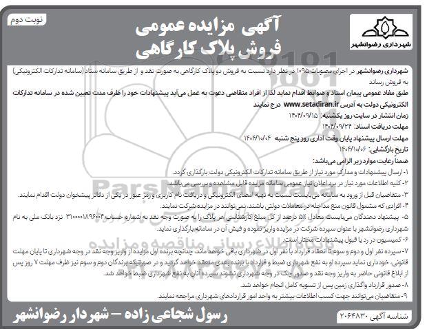 شهرداری رضوانشهر در اجرای مصوبات 1095 در نظر دارد نسبت به فروش دو پلاک کارگاهی به صورت نقد و ا از طریق سامانه ستاد سامانه تدارکات الکترونیکی به فروش رساند طبق مفاد عمومی پیمان اسناد و ضوابط اقدام نماید لذا از افراد متقاضی دعوت به عمل میآید پیشنهادات خود را ظرف مدت تعیین