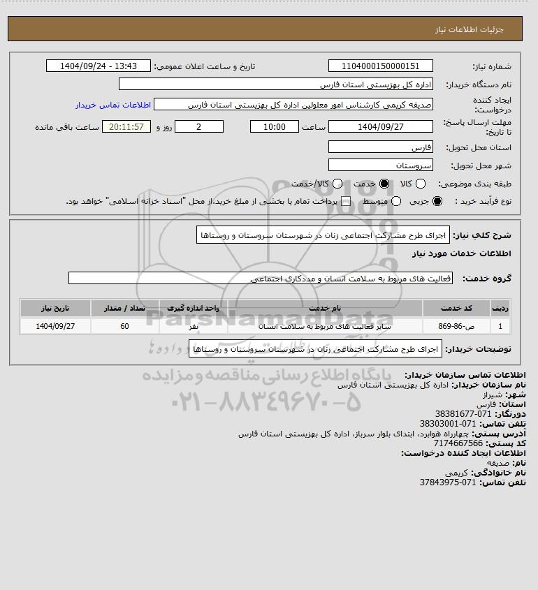 توضیحات خریدار:اجرای طرح مشارکت اجتماعی زنان در شهرستان سروستان و روستاها