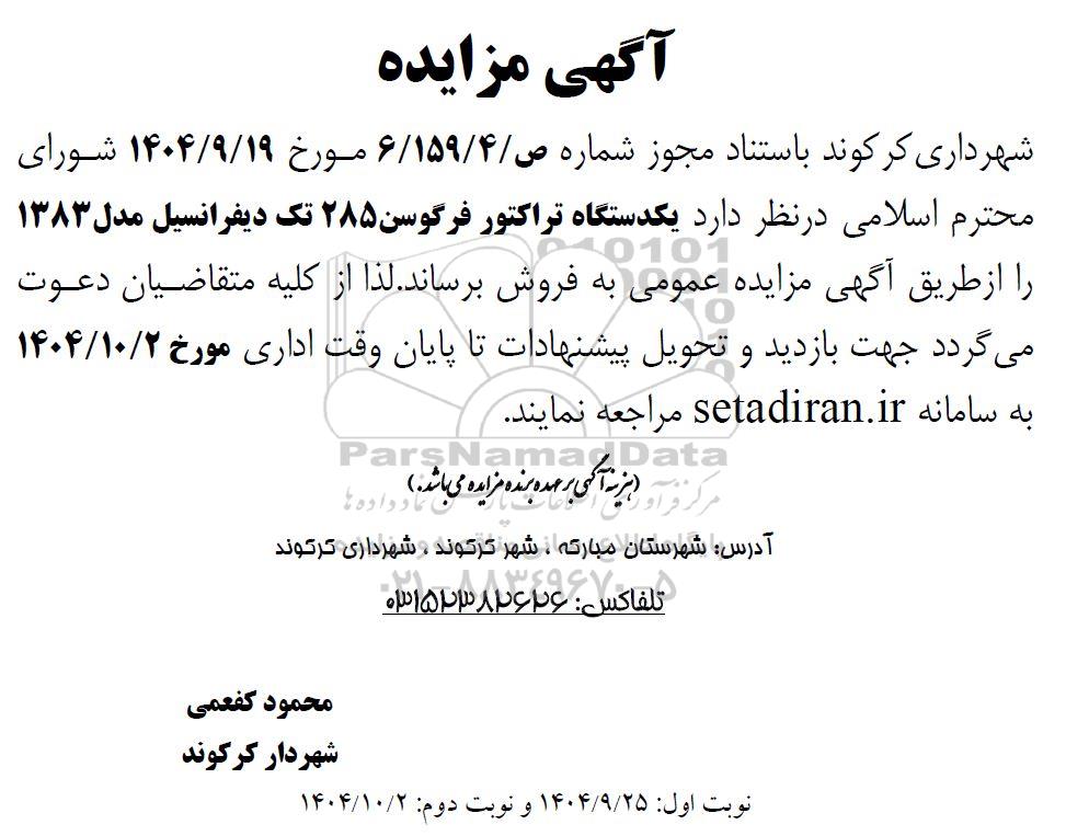 شهرداری کرکوند باستناد مجوز شماره ص . 6.159.4. مورخ 1404.9.19 شورای محترم اسلامی در نظر دارد یکدستگاه تراکتور فرگوسن 285 تک دیفرانسیل مدل 1383 را از طریق آگهی مزایده عمومی به فروش برساند. لذا از کلیه متقاضیان دعوت میگردد جهت بازدید و تحویل پیشنهادات تا پایان وقت اداری مورخ 1404.10.2 به سامانه ستاد ایران مراجعه نمایند.