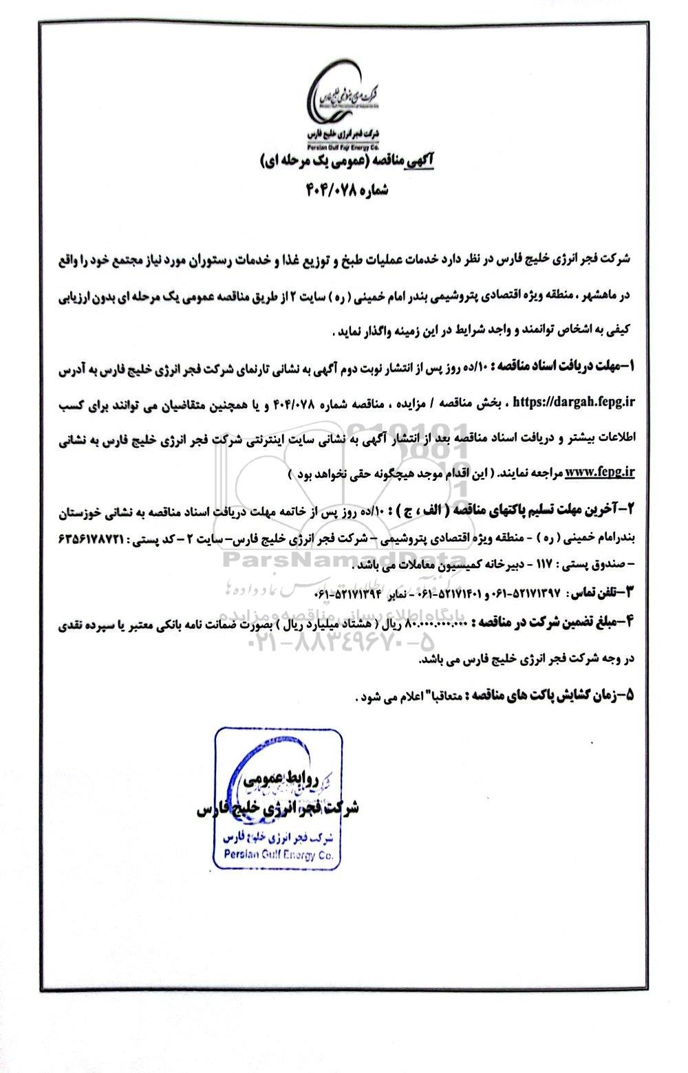 شرکت فجر انرژی خلیج فارس در نظر دارد خدمات عملیات طبخ و توزیع غذا و خدمات رستوران مورد نیاز مجتمع خود را واقع در ماهشهر، منطقه ویژه اقتصادی پتروشیمی بندر امام خمینی (ره) سایت 2 از طریق مناقصه عمومی یک مرحله ای بدون ارزیابی کیفی به اشخاص توانمند و واجد شرایط در این زمینه واگذار نماید.