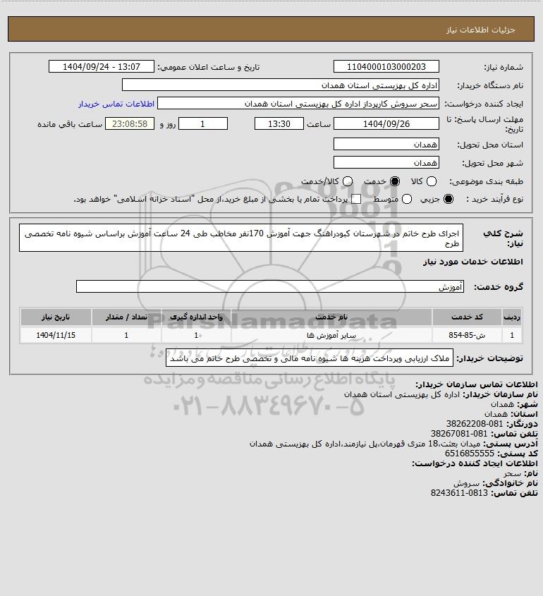 شرح کلی نیاز: اجرای طرح خاتم در شهرستان کبودراهنگ جهت آموزش 170نفر مخاطب طی 24 ساعت آموزش براساس شیوه نامه تخصصی طرح