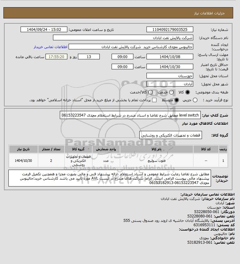 شرح کلی نیاز: level switch مطابق شرح تقاضا و اسناد مندرج در شرایط استعلام محمدی 06153223547