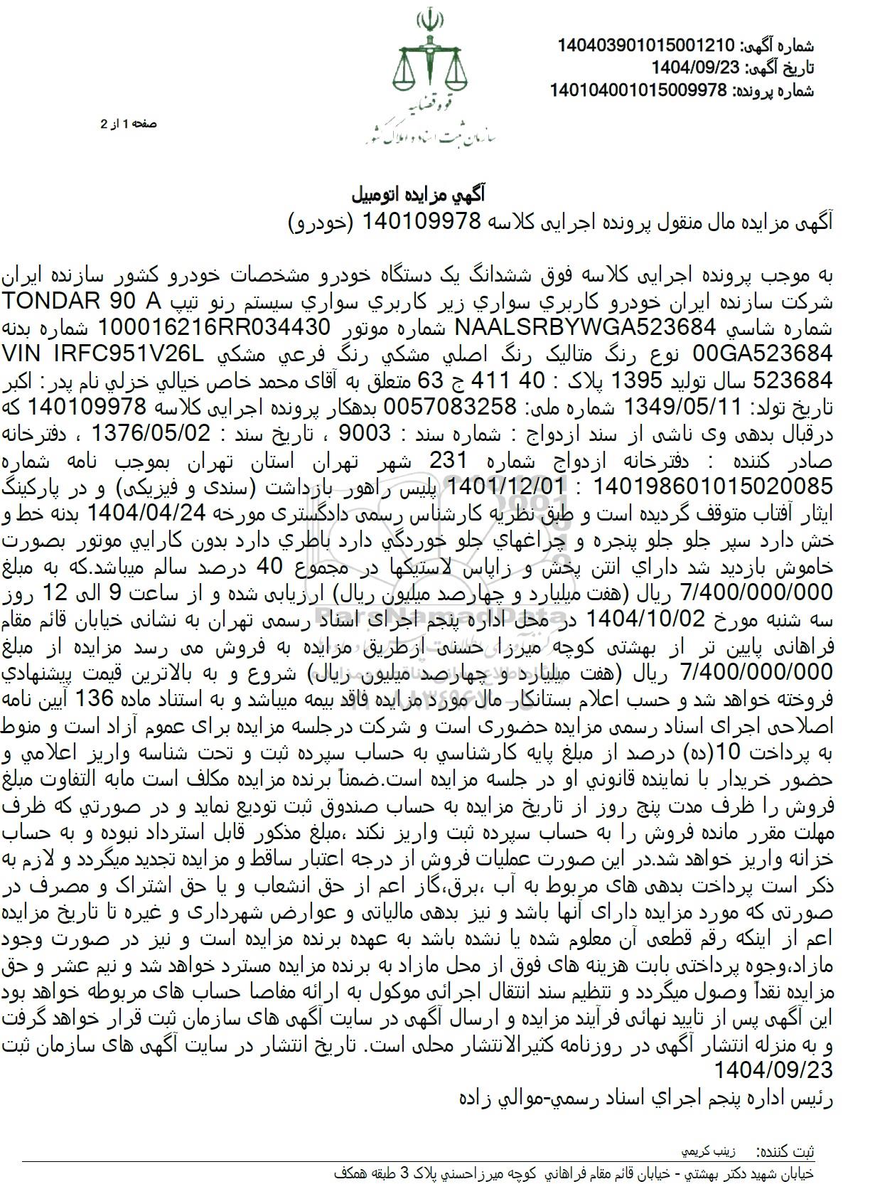 به موجب پرونده اجرایی کلاسه فوق ششدانگ یک دستگاه خودرو مشخصات خودرو کشور سازنده ایران شرکت سازنده ایران خودرو کاربری سواری زير كاربری سواری سیستم رنو تيپ TONDAR 90 A 100016216 شماره بدنهRR034430 شماره موتور NAALSRBYWGA523684 شماره شاسي VIN IRFC951V26 00523684 نوع رنگ متالیک رنگ اصلي مشکی رنگ فرعي مشكي 523684 سال تولید 1395 پلاک : 41140 ج 63 متعلق به آقای محمد خاص خيالي خزلی نام پدر: اکبر تاریخ تولد : 1349.05.11 شماره ملی 0057083258 بدهکار پرونده اجرایی کلاسه 140109978 که در قبال بدهی وی ناشی از سند ازدواج : شماره سند : 9003 ، تاریخ سند : 1376.05.02 ، دفترخانه صادر کننده : دفترخانه ازدواج شماره 231 شهر تهران استان تهران بموجب نامه شماره 140198601015020085 : 1401.12.01 پلیس راهور بازداشت سندی و فیزیکی و در پارکینگ ایثار آفتاب متوقف گردیده است و طبق نظریه کارشناس رسمی دادگستری مورخه 1404.04.24 بدنه خط و خش دارد سپر جلو جلو پنجره و چراغهای جلو خوردگي دارد باطري دارد بدون کارايي موتور بصورت خاموش بازدید شد دارای انتن پخش و زاپاس لاستیکها در مجموع 40 درصد سالم میباشد. که به مبلغ 7.400.000.000 ریال هفت میلیارد و چهارصد میلیون ریال ارزیابی شده و از ساعت 9 الی 12 روز سه شنبه مورخ 1404.10.02 در محل اداره پنجم اجرای اسناد رسمی تهران به نشانی خیابان قائم مقام فراهانی پایین تر از بهشتی کوچه میرزا حسنی از طریق مزایده به فروش میرسد مزایده از مبلغ 7.400.000.000 ریال هفت میلیارد و چهارصد میلیون ریال شروع و به بالاترین قیمت پیشنهادی فروخته خواهد شد و حسب اعلام بستانکار مال مورد مزایده فاقد بیمه میباشد و به استناد ماده 136 آیین نامه اصلاحی اجرای اسناد رسمی مزایده حضوری است و شرکت در جلسه مزایده برای عموم آزاد است و منوط به پرداخت (10 ده درصد از مبلغ پایه کارشناسی به حساب سپرده ثبت و تحت شناسه واریز اعلامي و حضور خریدار با نماینده قانونی او در جلسه مزایده است. ضمنا برنده مزایده مکلف است ما به التفاوت مبلغ فروش را ظرف مدت پنج روز از تاریخ مزایده به حساب صندوق ثبت تودیع نماید و در صورتی که ظرف مهلت مقرر مانده فروش را به حساب سپرده ثبت واریز نکند ، مبلغ مذکور قابل استرداد نبوده و به حساب خزانه واریز خواهد شد. در این صورت عملیات فروش از درجه اعتبار ساقط و مزایده تجدید میگردد و لازم به ذکر است پرداخت بدهی های مربوط به آب برق گاز اعم از حق انشعاب و یا حق اشتراک و مصرف در صورتی که مورد مزایده دارای آنها باشد و نیز بدهی مالیاتی و عوارض شهرداری و غیره تا تاریخ مزایده اعم از اینکه رقم قطعی آن معلوم شده یا نشده باشد به عهده برنده مزایده است و نیز در صورت وجود مازاد، وجوه پرداختی بابت هزینه های فوق از محل مازاد به برنده مزایده مسترد خواهد شد و نیم عشر و حق مزایده نقداً وصول میگردد و تنظیم سند انتقال اجرائی موکول به ارائه مفاصا حسابهای مربوطه خواهد بود این آگهی پس از تایید نهایی فرآیند مزایده و ارسال آگهی در سایت آگهی های سازمان ثبت قرار خواهد گرفت و به منزله انتشار آگهی در روزنامه کثیر الانتشار محلی است. تاریخ انتشار در سایت آگهی های سازمان ثبت 1404.09.23