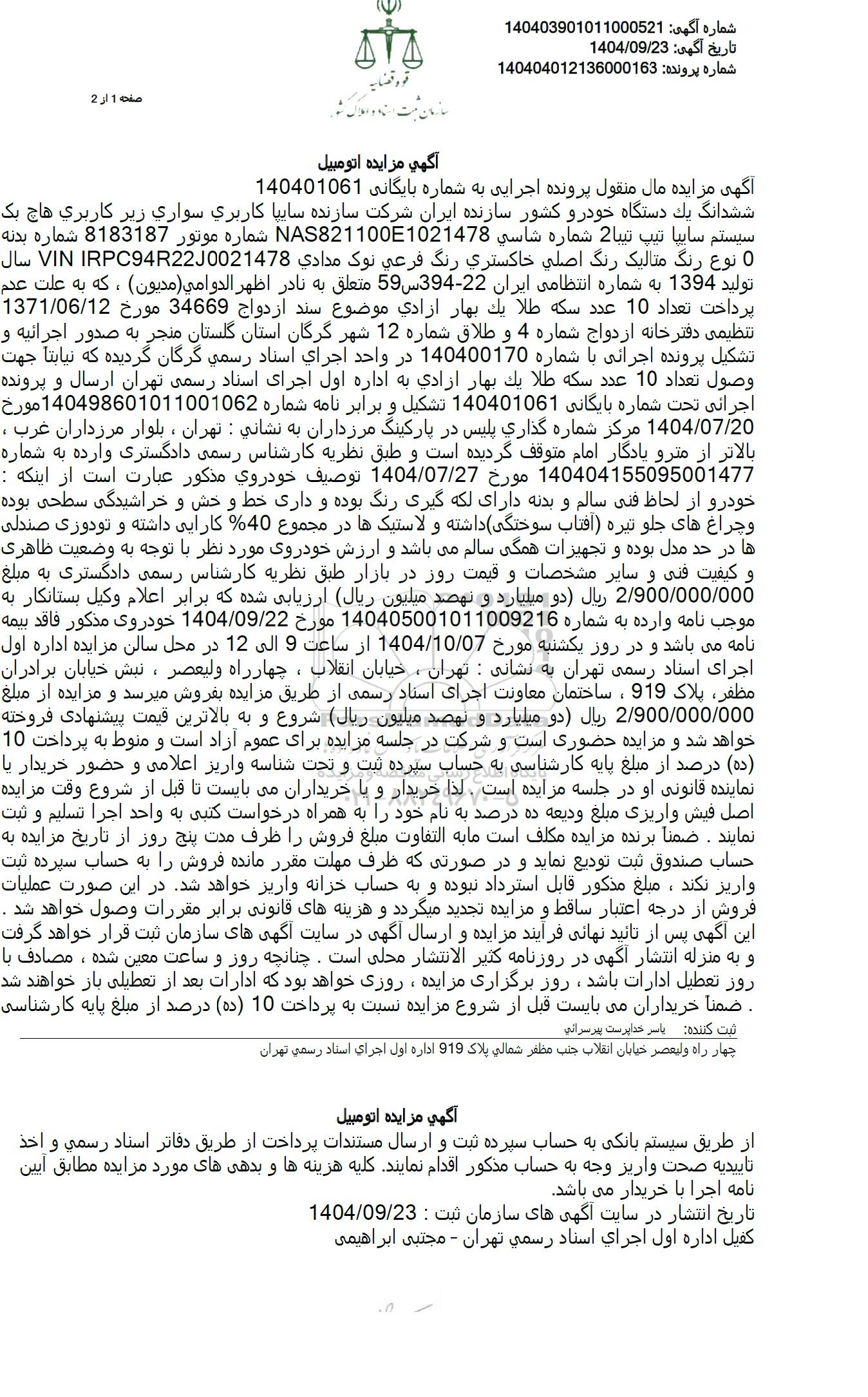 ششدانگ یک دستگاه خودرو کشور سازنده ایران شرکت سازنده سایپا کاربری سواری زیر کاربری هاچ بک سیستم سایپا تیپ تیبا 2 شماره شاسی NAS821100E1021478 شماره موتور 8183187 شماره بدنه نوع رنگ متالیک رنگ اصلی خاکستری رنگ فرعی نوک مدادی VIN IRPC94R22J0021478 سال تولید 1394 به شماره انتظامی ایران 22-394 س 59 متعلق به نادر اظهر الدوامی (مدیون)، که به علت عدم پرداخت تعداد 10 عدد سکه طلا یك بهار آزادی موضوع سند ازدواج 34669 مورخ 1371.06.12 تنظیمی دفترخانه ازدواج شماره 4 و طلاق شماره 12 شهر گرگان استان گلستان منجر به صدور اجرائیه و تشکیل پرونده اجرائی با شماره 140400170 در واحد اجرای اسناد رسمی گرگان گردیده که نیابتا جهت وصول تعداد 10 عدد سکه طلا یك بهار آزادی به اداره اول اجرای اسناد رسمی تهران ارسال و پرونده اجرائی تحت شماره بایگانی 140401061 تشکیل و برابر نامه شماره 140498601011001062 مورخ 1404.07.20 مرکز شماره گذاری پلیس در پارکینگ مرزداران به نشانی: تهران ، بلوار مرزداران غرب، بالاتر از مترو یادگار امام متوقف گردیده است و طبق نظریه کارشناس رسمی دادگستری وارده به شماره 140404155095001477 مورخ 1404.07.27 توصیف خودروی مذکور عبارت است از اینکه : خودرو از لحاظ فنی سالم و بدنه دارای لکه گیری رنگ بوده و داری خط و خش و خراشیدگی سطحی بوده و چراغ های جلو تیره (آفتاب سوختگی) داشته و لاستیکها در مجموع 40% کارایی داشته و تودوزی صندلی ها در حد مدل بوده و تجهیزات همگی سالم میباشد و ارزش خودروی مورد نظر با توجه به وضعیت ظاهری و کیفیت فنی و سایر مشخصات و قیمت روز در بازار طبق نظریه کارشناس رسمی دادگستری به مبلغ 2.900.000.000 ریال دو میلیارد و نهصد میلیون ریال ارزیابی شده که برابر اعلام وکیل بستانکار به موجب نامه وارده به شماره 140405001011009216 مورخ 1404.09.22 خودروی مذکور فاقد بیمه نامه می باشد و در روز یکشنبه مورخ 1404.10.07 از ساعت 9 الی 12 در محل سالن مزایده اداره اول اجرای اسناد رسمی تهران به نشانی : تهران ، خیابان انقلاب ، چهارراه ولیعصر ، نبش خیابان برادران مظفر پلاک 919 ، ساختمان معاونت اجرای اسناد رسمی از طریق مزایده بفروش میرسد و مزایده از مبلغ 2.900.000.000 ریال (دو میلیارد و نهصد میلیون ریال) شروع و به بالاترین قیمت پیشنهادی فروخته خواهد شد و مزایده حضوری است و شرکت در جلسه مزایده برای عموم آزاد است و منوط به پرداخت 10 (ده) درصد از مبلغ پایه کارشناسی به حساب سپرده ثبت و تحت شناسه واریز اعلامی و حضور خریدار یا نماینده قانونی او در جلسه مزایده است. لذا خریدار و یا خریداران می بایست تا قبل از شروع وقت مزایده اصل فیش واریزی مبلغ ودیعه ده درصد به نام خود را به همراه درخواست کتبی به واحد اجرا تسلیم و ثبت نمایند . ضمنا برنده مزایده مکلف است ما به التفاوت مبلغ فروش را ظرف مدت پنج روز از تاریخ مزایده به حساب صندوق ثبت تودیع نماید و در صورتی که ظرف مهلت مقرر مانده فروش را به حساب سپرده ثبت واریز نکند ، مبلغ مذکور قابل استرداد نبوده و به حساب خزانه واریز خواهد شد. در این صورت عملیات فروش از درجه اعتبار ساقط و مزایده تجدید میگردد و هزینه های قانونی برابر مقررات وصول خواهد شد . این آگهی پس از تائید نهایی فرآیند مزایده و ارسال آگهی در سایت آگهی های سازمان ثبت قرار خواهد گرفت و به منزله انتشار آگهی در روزنامه کثیر الانتشار محلی است. چنانچه روز و ساعت معین شده ، مصادف با روز تعطیل ادارات باشد، روز برگزاری مزایده، روزی خواهد بود که ادارات بعد از تعطیلی باز خواهند شد. ضمناً خریداران می بایست قبل از شروع مزایده نسبت به پرداخت 10 (ده) درصد از مبلغ پایه کارشناس از طریق سیستم بانکی به حساب سپرده ثبت و ارسال مستندات پرداخت از طریق دفاتر اسناد رسمی و اخذ تاییدیه صحت واریز وجه به حساب مذکور اقدام نمایند. کلیه هزینه ها و بدهیهای مورد مزایده مطابق آیین نامه اجرا با خریدار می باشد.