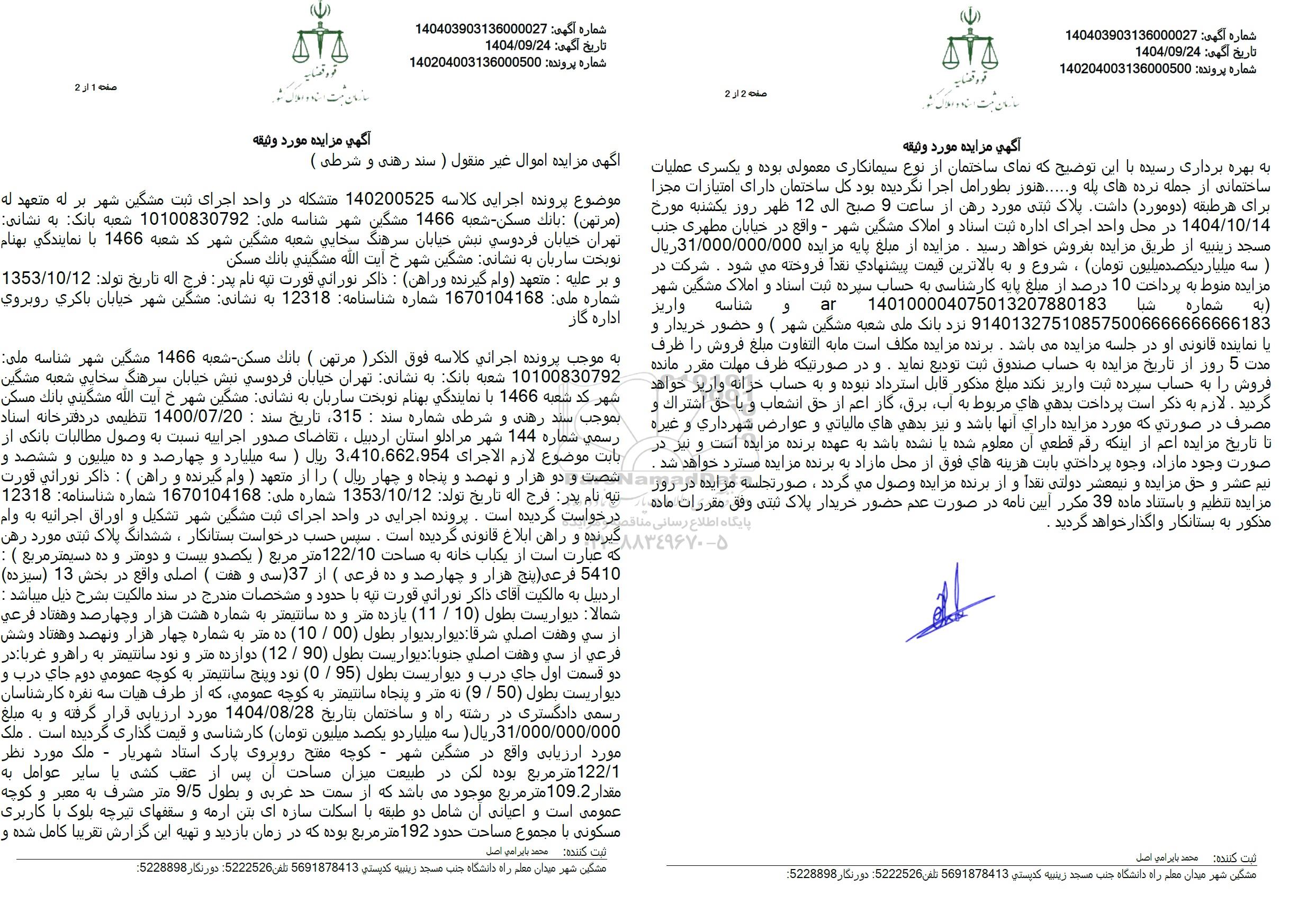 به موجب پرونده اجرائي كلاسه فوق الذكر ( مرتهن ( بانك مسکن - شعبه 1466 مشگین شهر شناسه ملی: 10100830792 شعبه بانک به نشانی تهران خیابان فردوسی نبش خیابان سرهنگ سخایی شعبه مشگین شهر کد شعبه 1466 با نمایندگی بهنام نوبخت سازیان به نشانی مشگین شهر خ آیت الله مشكيني بانك مسكن بموجب سند رهنی و شرطی شماره سند : 315 تاریخ سند : 1400/07/20 تنظیمی در دفترخانه اسناد رسمي شماره 144 شهر مرادلو استان اردبیل، تقاضای صدور اجرائیه نسبت به وصول مطالبات بانکی از بابت موضوع لازم الاجراى 3.410.662,954 ریال ( سه میلیارد و چهارصد و ده میلیون و ششصد و شصت و دو هزار و نهصد و پنجاه و چهار ریال ) را از متعهد ) وام گیرنده و راهن ) : ذاكر نوراني فورت تيه نام پدر فرج اله تاریخ تولد: 1353/10/12 شماره ملی 1670104168 شماره شناسنامه: 12318 درخواست گردیده است. پرونده اجرایی در واحد اجرای ثبت مشگین شهر تشکیل و اوراق اجرائیه به ولم گیرنده و راهن ابلاغ قانونی گردیده است. سپس حسب درخواست بستانکار، ششدانگ پلاک ثبتی مورد رهن که عبارت است از یکباب خانه به مساحت 122/10 متر مربع ) يکصد و بیست و دومتر و ده دسیمتر مربع ) : 5410 فرعی (پنج هزار و چهارصد و ده فرعی ( از 37 سی و هفت ( اصلی واقع در بخش 13 (سیزده) اردبیل به مالکیت آقای ذاکر نورانی قورت تپه با حدود و مشخصات مندرج در سند مالکیت بشرح ذیل میباشد : شمالا دیواریست بطول (10) / (11) یازده متر و ده سانتیمتر به شماره هشت هزار و چهارصد و هفتاد فرعي از سی و هفت اصلی شرقا ديوار بديوار بطول (00 / 10) ده متر به شماره چهار هزار و نهصد و هفتاد و شش فرعی از سی و هفت اصلی جنوبا ديواريست بطول (90) / (12) دوازده متر و نود سانتیمتر به راهرو غربا در دو قسمت اول جای درب و دیواریست بطول (95) / (0) نود و پنج سانتیمتر به کوچه عمومي دوم جای درب و دیواریست بطول (9/50) به متر و پنجاه سانتیمتر به کوچه عمومی که از طرف هیات سه نفره کارشناسان رسمی دادگستری در رشته راه و ساختمان بتاریخ 1404.08.28 مورد ارزیابی قرار گرفته و به مبلغ 31.000.000.000 ريال ) سه میلیاردو یکصد میلیون تومان کارشناسی و قیمت گذاری گردیده است . ملک مورد ارزیابی واقع در مشگین شهر - کوچه مفتح روبروی پارک استاد شهریار - ملک مورد نظر 122/1 متر مربع بوده لکن در طبیعت میزان مساحت آن پس از عقب کشی یا سایر عوامل به مقدار 109.2 متر مربع موجود میباشد که از سمت حد غربی و بطول 9/5 متر مشرف به معیر و کوچه عمومی است و اعیانی آن شامل دو طبقه با اسکلت سازه ای بتن آرمه و سقفهای تیرچه بلوک با کاربری مسکونی با مجموع مساحت حدود 192 متر مربع بوده که در زمان بازدید و تهیه این گزارش تقریبا کامل شده و به بهره برداری رسیده با این توضیح که نمای ساختمان از نوع سیمانکاری معمولی بوده و یکسری عملیات ساختمانی از جمله نرده های پله و...... هنوز بطور امل اجرا نگردیده بود کل ساختمان دارای امتیازات مجرا برای هر طبقه دومورد داشت پلاک ثبتی مورد رهن از ساعت 9 صبح الى 12 ظهر روز یکشنبه مورخ 1404.10.14 در محل واحد اجرای اداره ثبت اسناد و املاک مشگین شهر - واقع در خیابان مطهری جنب مسجد رینبیه از طریق مزایده بفروش خواهد رسید. مزایده از مبلغ پایه مزایده 31.000.000.000 ريال سه میلیار دیکصد میلیون تومان)، شروع و به بالاترین قیمت پیشنهادي نقداً فروخته می شود . شرکت در مزایده منوط به پرداخت 10 درصد از مبلغ پایه کارشناسی به حساب سپرده ثبت اسناد و املاک مشگین شهر به شماره واريز 914013275108575006666666666183 نزد بانک ملی شعبه مشگین شهر ) و حضور خریدار و با نماینده قانونی او در جلسه مزایده می باشد. برنده مزایده مکلف است مابه التفاوت مبلغ فروش را ظرف شبا 140100004075013207880183 ar و شناسه مدت 5 روز از تاریخ مزایده به حساب صندوق ثبت تودیع نماید و در صورتیکه ظرف مهلت مقرر مانده فروش را به حساب سپرده ثبت واریز نکند مبلغ مذکور قابل استرداد نبوده و به حساب خزانه واریز خواهد گردید . لازم به ذکر است پرداخت بدهی های مربوط به آب برق گار اعم از حق انشعاب و با حق اشتراك و مصرف در صورتی که مورد مزایده دارای آنها باشد و نیز بدهي هاي مالياتي و عوارض شهر