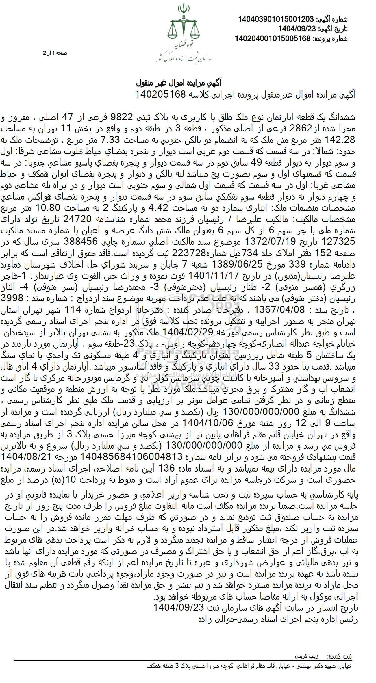ششدانگ یک قطعه آپارتمان نوع ملک طلق با کاربری به پلاک ثبتی 9822 فرعی از 47 اصلی ، مفروز و مجزا شده از 2862 فرعی از اصلی مذکور، قطعه 3 در طبقه دوم و واقع در بخش 11 تهران به مساحت 142.28 متر مربع متن ملک که به انضمام دو بالکن جنوبی به مساحت 7.33 متر مربع ، توضیحات ملک به حدود شمالا در سه قسمت که قسمت دوم غربی است دیوار و پنجره بقضای حیاط خلوت مشاعی شرقا اول و سوم دیوار به دیوار قطعه 49 سابق دوم در سه قسمت دیوار و پنجره بقضای یاسیو مشاعی جنوبا در سه قسمت که قسمتهای اول و سوم بصورت یخ میباشد لبه بالکن و دیوار و پنجره بفضای ایوان همکف و حیاط مشاعی غربا اول در سه قسمت که قسمت اول شمالی و سوم جنوبی است دیوار و در براه پله مشاعی دوم و چهارم دیوار به دیوار قطعه سوم تفکیکی سابق سوم در سه قسمت دیوار و پنجره بقضای هواکش مشاعی مشخصات منضمات ملک انباری شماره دو به مساحت 4.42 و پارکینگ 2 به مساحت 10.80 متر مربع مشخصات مالکیت مالکیت علیرضا . رئیسیان فرزند محمد شماره شناسنامه 24720 تاریخ تولد دارای شماره ملی با جز سهم 6 از کل سهم 6 بعنوان مالک شش دانگ عرصه و اعیان با شماره مستند مالکیت 127325 تاریخ 1372.07.19 موضوع سند مالکیت اصلی بشماره چاپی 388456 سری سال که در صفحه 152 دفتر املاک جلد 734 ذیل شماره 223728 ثبت گردیده است. فاقد حقوق ارتفاقی است که برابر دادنامه شماره 339 مورخ 1389.06.25 شعبه 7 جابان و سربند شورای حل اختلاف شهرستان دماوند علیرضا رئیسیان (مدیون در تاریخ 1401.11.17 فوت نموده و وراث حین الفوت وى عبارتندار: -1 - هاجر زرگری همسر (متوفی) -2 طناز رئیسیان (دختر متوفی) - محمدرضا رئیسیان پسر متوفى) -4 النار رئیسیان دختر (متوفی می باشند که به علت عدم پرداخت مهریه موضوع سند ازدواج : شماره سند : 3998 تاریخ سند : 1367.04.08 ، دفترخانه صادر کننده : دفترخانه ازدواج شماره 114 شهر تهران استان تهران منجر به صدور اجراییه و تشکیل پرونده تحت کلاسه فوق در اداره پنجم اجرای اسناد رسمی گردیده است و طبق نظر کارشناس رسمی مورخه 1404.02.29 ملک مذکور به نشانی تهران بالاتر از سید خندان خیابام خواجه عبداله انصاری کوچه چهاردهم کوچه راوش، پلاک -23 - طبقه سوم، آپارتمان مورد بازدید در یک ساختمان 5 طبقه شامل زیرزمین بعنوان پارکینگ و انباری و 4 طبقه مسکونی تک واحدی با نمای سنگ میباشد . قدمت بنا حدود 33 سال دارای انباری و پارکینگ و فاقد آسانسور میباشد . آپارتمان دارای 4 اتاق هال و سرویس بهداشتی و آشپرخانه با کابینت چوبی سرمایش کولر آبی و گرمایش موتورخانه مرکزی با گاز است. انشعاب آب و گاز مشترک و برق مجری میباشد. ملک مورد نظر با توجه به ارزش منطقه و موقعیت مکانی و مقطع زمانی و در نظر گرفتن تمامی عوامل موثر بر ارزیابی و قدمت ملک طبق نظر کارشناس رسمی . ششدانگ به مبلغ 130.000.000.000 ریال یکصد و سی میلیارد ریال ارزیابی گردیده است و مزایده از ساعت 9 الی 12 روز شنبه مورخ 1404.10.06 در محل سالن مزایده اداره پنجم اجرای اسناد رسمی واقع در تهران خیابان قائم مقام فراهانی پایین تر از بهشتی کوچه میرزا حسنی پلاک 3 از طریق مزایده به فروش می رسد و مزایده از مبلغ 130.000.000.000 یکصد و سی میلیارد ریال شروع و به بالاترین قیمت پیشنهادی فروخته میشود و برابر نامه شماره 140485684106004813 مورخه 1404.08.21 مال مورد مزایده دارای بیمه نمیباشد و به استناد ماده 136 ایین نامه اصلاحی اجرای اسناد رسمی مزایده حضوری است و شرکت در جلسه مزایده برای عموم آزاد است و منوط به پرداخت 10 (ده) درصد از مبلغ پایه کارشناسی به حساب سپرده ثبت و تحت شناسه واریز اعلامی و حضور خریدار با نماینده قانونی او در جلسه مزایده است. ضمنا برنده مزایده مکلف است ما به التفاوت مبلغ فروش را ظرف مدت پنج روز از تاریخ مزایده به حساب صندوق ثبت تودیع نماید و در صورتی که ظرف مهلت مقرر مانده فروش را به حساب سپرده ثبت واریز نکند مبلغ مذکور قابل استرداد نبوده و به حساب خزانه واریز خواهد شد. در این صورت عملیات فروش از درجه اعتبار ساقط و مزایده تجدید میگردد و لازم به ذکر است پرداخت بدهی های مربوط به آب برق گاز اعم از حق 