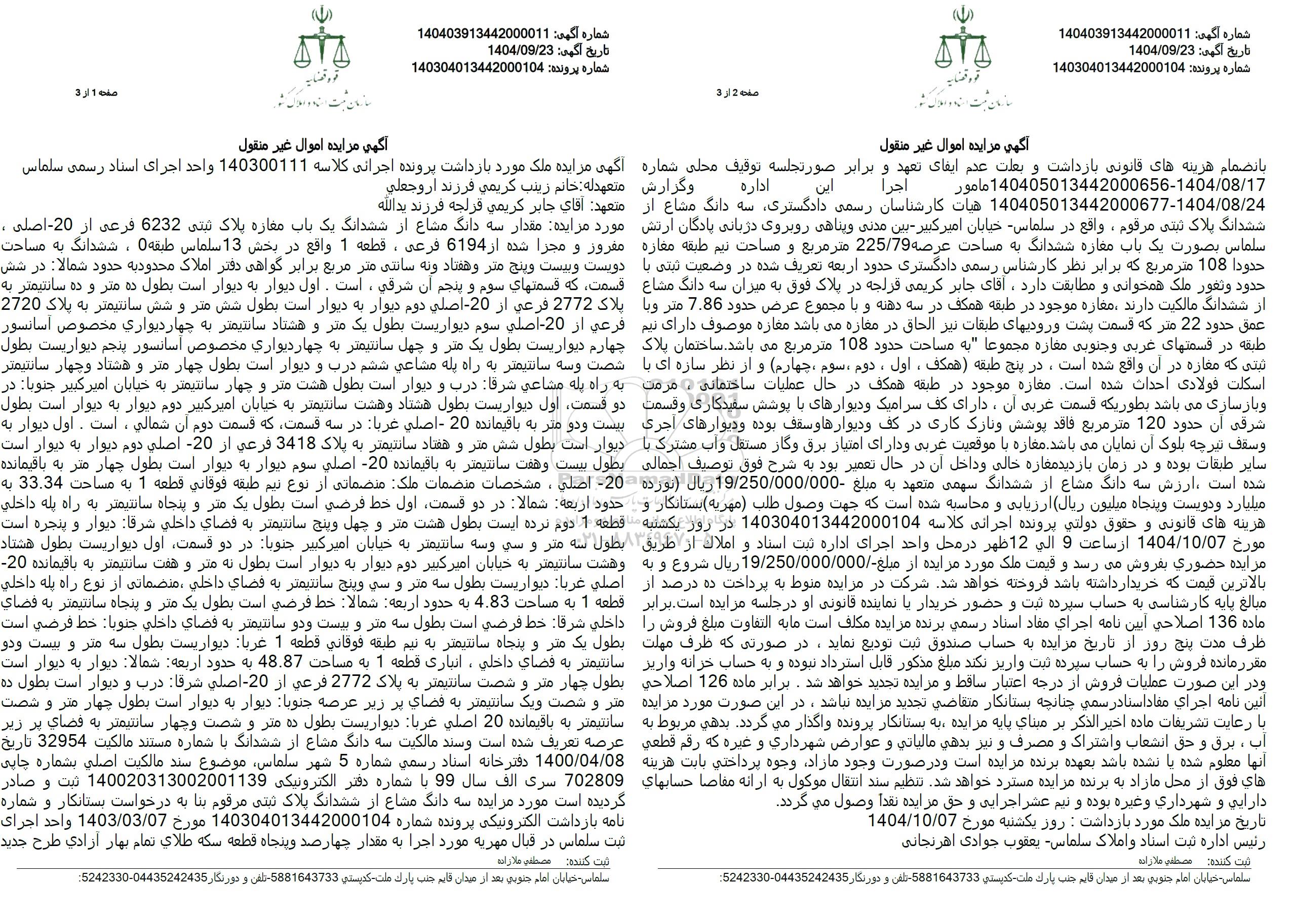 1404.08.17-140405013442000656 عامور این بانضمام غریبه های قانونی بازداشت و اجرا اداره و گزارش 140405013442000677-1404.08.24 هیات کارشناسان رسمی دادگستری سه دانگ مشاع از شندانگ بلاک شندی مرقوم واقع در سلمان - خیابان امیر کبیر بین مددی و بدهی روبروی دریانی دریانی بادگان ، ارتش سماس تصورت یک باب مغازه ششدانگ به صاحت عرضه 225.79 متر مربع و مساحت نیم طبقه مغازه حدودا 108 متر مربع که برابر نظر کارشناس رسمی دادگستری حدود اربعه تعریف شده در وضعیت ابتی با حدود وتعور منك همخوانی و مطابعت دارد. آقای جابر کریمی قراچه در پلاک فوق به میزان سه دانگ مشاع از ششدانگ مالکیت دارند معاره موجود در طبقه همکک در به دفته و با مجموع عرض حدود 786 متر ون عمل حدود 22 متر که قسمت پشت ورودیهای طبقات نیز الحاق در مغازه می باشد مغازه موصوف دارای نیر طبقه در قسمتهای عربی و جنوبی مغازه مجموعا به مساحت حدود 108 متر مربع می باشد. ساختمان پلاک سی که مغازه در آن واقع شده است. در پنج طبقه همکف، اول . اول، دوم سوم چهارم) و از نظر سازه ای به اسکلت فولادی احداث شده است. مغازه موجود در طبقه همکف در حال عطیات ساختمانی ، مرمت و بازسازی می باشد بطوریکه قسمت غربی آن، دارای تک سرامیک و دیوارهای با پوشش ساندکاری و قسمت شرقی آن حدود 120 متر مربع فاقد پوشتی و نازک کاری در کف و دیوار ها و سقف بوده و دیوارهای آجری وسقف تیرچه بلوک آن نمایان می باشند. مغازه با موقعیت غربی و دارای امتیاز برق و کار مستقل و آب مشترک با سایر طبقات بوده و در زمان بازدید مغازه خالی و داخل آن در حال تعمیر بود به شرح فوق توصیف جمالی شده است ارزش سه دانگ مشاع از شندانگ سهمی متعهد به مبلغ 19.250.000.000 ریال (توریة میلیارد و دویست و بنده میلیون ریال) از ریایی و محاسبه شده است که جهت وصول طلب (مهریه) بستانکار و هزینه های قانونی و حقوق دولتی پرونده اجرائی كلامه 140304013442000104 در روز یکشنبه مورخ 1404.10.07 ارساعت 9 الى 12 ظهر در محل واحد اجرای اداره ثبت اسناد و املاک از طریق مزیده حضوری بفروش می رسد و قیمت ملک مورد مزایده از سلخ .19.250.000.000 ریال شروع و به بالاترین قیمت که خریدار داشته باشد. فروخته خواهد شد. شرکت در مزایده منوط به پرداخت ده درصد از مانع پایه کارشناسی به حساب سپرده ثبت و حضور خریدار با نماینده قانونی او در جلسه مزایده است. برابر عاده 136 اصلاحی این نامه اجرای مفاد اسناد رسمی برنده مزایده مکلف است ما به استفاوت مبلغ فروش را طرف مدت پنج روز از تاریخ مزایده به حساب صندوق تیک تودیع نماید، در صورتی که طرف عملت مقر رمانده فروش را به حساب به را به حساب سپرده ثبت واریز کند میچ و وازیر کند منع مذکور قابل استرداد نبوده و به حساب خزانه واریر و در این صورت عطیات فروش از درجه اعصار ساقط و مزایده تحدید خواهد شد. برابره برابر ماده 126 اصلاحی انین نامه اجرای مفاد اسناد رسمی جانچه بستانکار متقاضی تجدید مزایده نباشد، در این صورت مورد مزایده با رعایت تشریفات ماده اخیر الذكر بر مبنای پایه مزایده به بستانکار پرونده واگذار می گردد. بدهی مربوط به اید، برق و حق انشعاب و اشتراک و مصرف و نیز بدهی مالیاتی و عوارض شهرداری و غیره که رقم قطعی انها معلوم شده با نشده باشد بعهده برنده مزایده است و در صورت وجود ماراد، وجوه پرداختی بابت هزینه های فوق از محل مازاد به برنده مزایده مسترد خواهد شد. تنظیم سند انتقال موکون به از آنه مقاضا حسابهای دارایی و شهرداری و غیره بوده و نیم عشر اجرایی و حتی مزایده بعدا وصول می گردد.