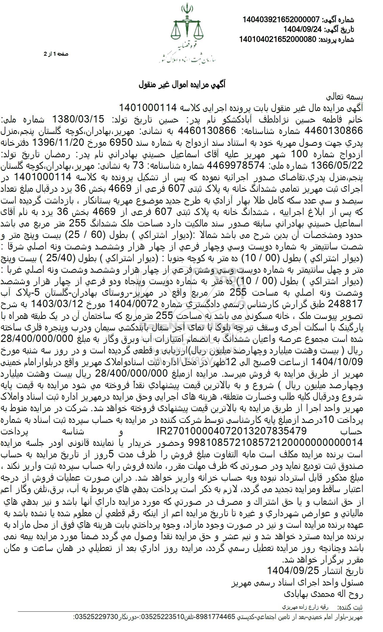 آگهی مزایده مال غیر منقول بابت پرونده اجرایی کلاسه 1401000114 خانم فاطمه حسین نژاد لطف آباد کشکو نام پدر حسین تاریخ تولد: 1380.03.15 شماره ملی 4460130866 شماره شناسنامه 4460130866 به نشانی مهریز بهادران کوچه گلستان پنجم منزل پدری جهت وصول مهریه خود به استناد سند ازدواج به شماره سند 6950 مورخ 1396.11.20 دفترخانه ازدواج شماره 100 شهر مهریز علیه آقای اسماعیل حسینی بهادرانی نام پدر رمضان تاریخ تولد 1366.05.22 شماره ملی 4469978574 شماره شناسنامه 73 به نشانی مهریز، بهادران کوچه گلستان پنجم، منزل پدری تقاضای صدور اجرائیه نموده که پس از تشکیل پرونده به کلاسه 1401000114 در اجرای ثبت مهریز تمامی ششدانگ خانه به پلاک ثبتی 607 فرعی از 4669 بخش 36 یزد در قبال مبلغ تعداد سیصد و سی عدد سکه کامل طلا بهار آزادی به طرح جدید موضوع مهریه بستانکار، بازداشت گردیده است. که پس از ابلاغ اجراییه ، ششدانگ خانه به پلاک ثبتی 607 فرعی از 4669 بخش 36 یزد به نام آقای اسماعیل حسینی بهادرانی سابقه صدور سند مالکیت دارد مساحت ملک ششدانگ 255 متر مربع می باشد. حدود و مشخصات آن بدین شرح می باشد شمالا : دیوار) اشتراکی ( بطول 60 . 25) بیست و پنج متر و شصت سانتیمتر به شماره دویست و سی و چهار فرعی از چهار هزار و ششصد و شصت و نه اصلی شرقا : دیوار اشتراکی ) بطول (00 . 10) ده متر به کوچه جنوبا : دیوار اشتراکی ) بطول (25.40 ) بیست و پنج متر و چهل سانتیمتر به شماره دویست و سی وشش فرعی از چهار هزار و ششصد و شصت و نه اصلی غربا : دیوار اشتراکی ) بطول (00 . 10) ده متر به شماره دویست و پنجاه و دو فرعی از چهار هزار و ششصد وشصت و نه اصلی به مساحت 255 متر مربع واقع در مهریز روستای بهادران گلستان 5- پلاک آب 248817 طبق گزارش کارشناس رسمی دادگستری شماره 1404.0072 مورخ 1403.03.12 به شرحتصویر پیوست ملک ، خانه مسکونی میباشد به مساحت 255 متر مربع که ساختمان آن در یک طبقه همراه با پارگینک با اسکلت أجرى وسقف تیرچه بلوک با نمای آجر سفال با بندکشی سیمان و درب وپنجره فلزی ساخته شده است مجموع عرصه و اعیان ششدانگ به انضمام امتیازات آب و برق و گاز به مبلغ 28.400.000.000 ریال ( بیست و هشت میلیارد و چهار صد میلیون ریال ارزیابی و قطعی گردیده است و در روز سه شنبه مورخ 1404.10.09 از ساعت 9 صبح الى 12 ظهر در محل اداره ثبت اسناد و املاک مهریز واقع در بلوار امام خمینی مهریز از طریق مزایده به فروش میرسد. مزایده از مبلغ 28.400.000.000 ریال بیست و هشت میلیارد و چهارصد میلیون ریال ) شروع و به بالاترین قیمت پیشنهادی نقداً فروخته میشود مزایده به قیمت پایه شروع و در قبال کلیه طلب و خسارت متعلقه هزینه های اجرایی و حق مزایده در مهریز اداره ثبت اسناد و املاک مهریز واحد اجرا از طریق مزایده به بالاترین قیمت پیشنهادی فروخته خواهد شد. شرکت در مزایده منوط به