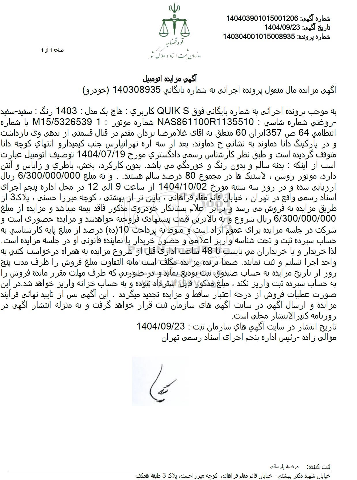 به موجب پرونده اجرائی به شماره بایگانی فوق QUIK S کاربری : هاچ بک مدل : 1403 رنگ : سفید - سفید با شماره M15.53265391 : شماره موتور NAS8611001135510 : روغني شماره شاسی انتظامی 64 ص 357 ایران 60 متعلق به آقای غلامرضا یزدان مقدم در قبال قسمتی از بدهی وی بازداشت و در پارکینگ دانا دماوند به نشاني خ دماوند بعد از سه اره تهرانپارس جنب کیمیدارو انتهای کوچه دانا متوقف گردیده است و طبق نظر کارشناس رسمی دادگستری مورخ 1404.07.19 توصیف اتومبیل عبارت است از اینکه : بدنه سالم و بدون رنگ و خوردگی می باشد بدون کار کرد ،پخش باطری و زاپاس و آنتن دارد موتور روشن ، لاستیکها در مجموع 80 درصد سالم هستند . و به مبلغ 6.300.000.000 ريال ارزیابی شده و در روز سه شنبه مورخ 1404.10.02 از ساعت 9 الی 12 در محل اداره پنجم اجرای اسناد رسمی واقع در تهران ، خیابان قائم مقام فراهانی، پایین تر از بهشتی ، کوچه میرزا حسنی ، پلاک 3 از طريق مزایده به فروش میرسد و برابر اعلام بستانکار خودروی مذکور فاقد بیمه میباشد و مزایده از مبلغ 6.300.000.000 ریال شروع و به بالاترین قیمت پیشنهادی فروخته خواهد شد و مزایده حضوری است و شرکت در جلسه مزایده برای عموم آزاد است و منوط به پرداخت 10 ده درصد از مبلغ پایه کارشناسی به حساب سپرده ثبت و تحت شناسه واریز اعلامی و حضور خریدار یا نماینده قانونی او در جلسه مزایده است. لذا خریدار و یا خریداران می بایست تا 48 ساعت اداری قبل از شروع مزایده به همراه درخواست کتبی به واحد اجرا تسلیم و ثبت نمایند. ضمنا برنده مزایده مکلف است ما به التفاوت مبلغ فروش را ظرف مدت پنج روز از تاریخ مزایده به حساب صندوق ثبت تودیع نماید و در صورتی که ظرف مهلت مقرر مانده فروش را به حساب سپرده ثبت واریز نکند، مبلغ مذکور قابل استرداد نبوده و به حساب خزانه واریز خواهد شد. در این صورت عملیات فروش از درجه اعتبار ساقط و مزایده تجدید میگردد. این آگهی پس از تایید نهایی فرآیند مزایده و ارسال آگهی در سایت آگهی های سازمان ثبت قرار خواهد گرفت و به منزله انتشار آگهی در روزنامه کثیر الانتشار محلی است.