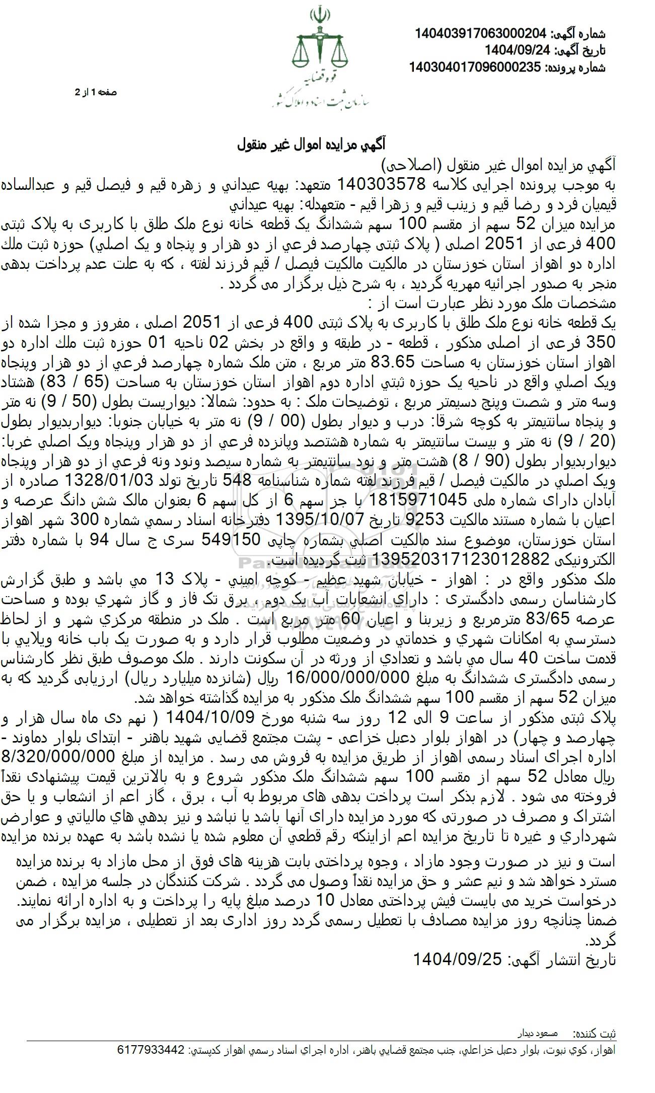 یک قطعه خانه نوع ملک طلق با کاربری به پلاک ثبتی 400 فرعی از 2051 اصلی، مغرور و مجزا شده از 350 فرعی از اصلی مذکور، قطعه - در طبقه و واقع در بخش 02 ناحیه 01 حوزه ثبت ملک اداره دو اهواز استان خوزستان به مساحت 83.65 متر مربع ، متن ملک شماره چهار صد فرعی از دو هزار و پنجاه و یک اصلی واقع در ناحیه یک حوزه ثبتی اداره دوم اهواز استان خوزستان به مساحت (65 . 83) هشتاد و سه متر و شصت و پنج دسیمتر مربع ، توضیحات ملک : به حدود شمالا دیواریست بطول (50) . (9) نه متر و پنجاه سانتیمتر به کوچه شرقا درب و دیوار بطول (00 . (9) نه متر به خیابان جنوبا دیوار بدیوار بطول 20 . 9 نه متر و بیست سانتیمتر به شماره هشتصد و پانزده فرعی از دو هزار وپنجاه و یک اصلی غربا دیوار بدیوار بطول 90 . (8) هشت متر و نود سانتیمتر به شماره سیصد و نود و نه فرعی از دو هزار و پنجاه و یک اصلی در مالکیت فیصل . قیم فرزند لفته شماره شناسنامه 548 تاریخ تولد 1328.01.03 صادره از آبادان دارای شماره ملی 1815971045 با جز سهم 6 از کل سهم 6 بعنوان مالک شش دانگ عرصه و اعیان با شماره مستند مالکیت 9253 تاریخ 1395.10.07 دفترخانه اسناد رسمی شماره 300 شهر اهواز استان خوزستان موضوع سند مالکیت اصلی بشماره چاپی 549150 سری ج سال 94 با شماره دفتر الکترونیکی 139520317123012882 ثبت گردیده است.