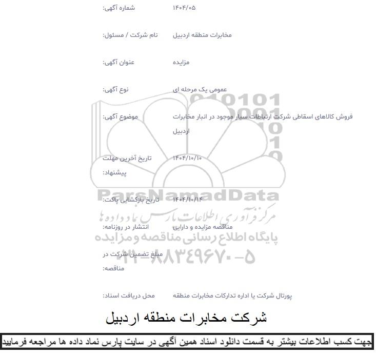 موضوع آگهی: فروش کالاهای اسقاطی شرکت ارتباطات سیار موجود در انبار مخابرات اردبیل