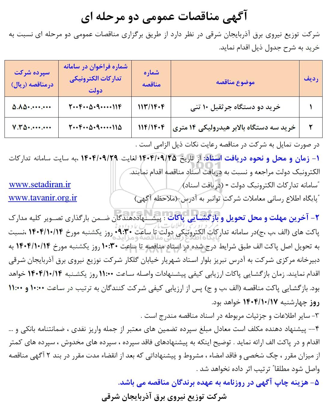 علاقه‌مندان می‌توانند جهت دریافت اسناد و اطلاعات تکمیلی، مناقصه خرید دو دستگاه جرثقیل 10 تنی و با سامانه مناقصات و مزایدات ایران پارس‌نماد داده ها 88349670 تماس حاصل نمایند.