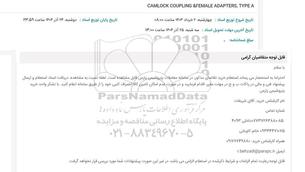 احتراما به استحضار میرساند. استعلام خرید تقاضای مذکور در سامانه معاملات پتروشیمی پارس قابل مشاهده است. لطفا نسبت به مشاهده دریافت اسناد استعلام و ارسال پیشنهاد فنی و مالی در پاکات ب و ج در مهلت مقرر اقدام فرمایید و در صورت عدم امکان تامین کالا انصراف کتبی خود را از طریق سامانه اعلام کنید با تشکر واحد خرید پتروشیمی پارس