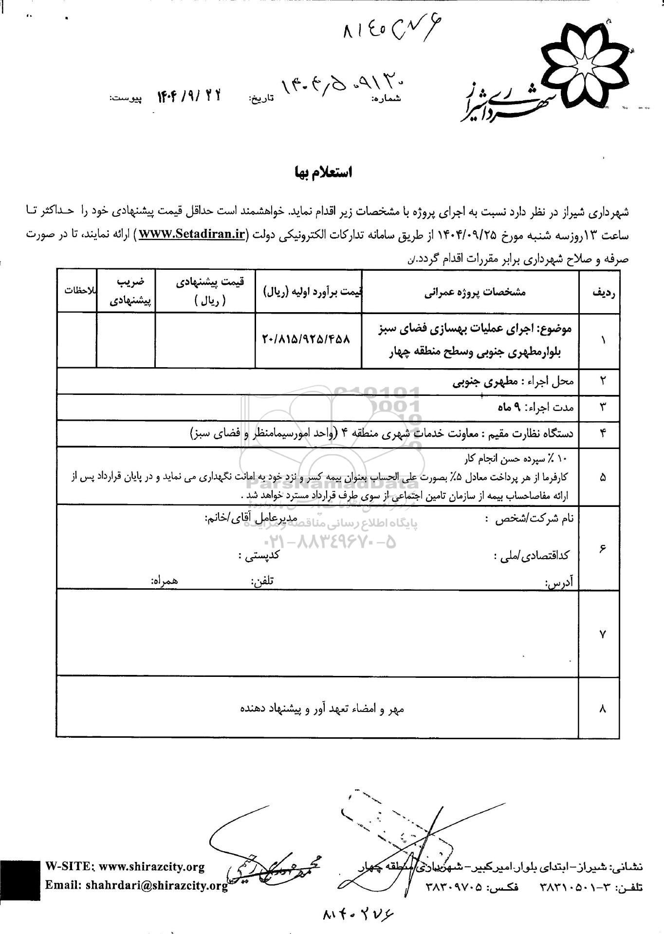 شهرداری شیراز در نظر دارد نسبت به اجرای پروژه با مشخصات زیر اقدام نماید. لذا خواهشمند است حداقل قیمت پیشنهادی خود را حداکثر تا ساعت 13 روز سه شنبه مورخ 1404.9.25 از طریق سامانه تدارکات الکترونیکی دولت (ستاد ایران ) ارائه نمایند تا در صورت صرفه و صلاح شهرداری برابر مقررات اقدام گردد.