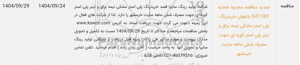 | مناقصه | تمدید مناقصه عمومی شماره 041183 با عنوان خرید رنگ پلی استر مشکی نیمه براق و تینر پلی استر کوره ای جهت مصرف شش ماهه سایت خرمشهر | شرکت تولید رینگ سایپا قصد خرید رنگ پلی استر مشکی نیمه براق و تینر پلی استر کوره ای جهت مصرف شش ماهه سایت خرمشهر را دارد. لذا از شرکت های فعال در این زمینه دعوت میگردد جهت دریافت اسناد به آدرس www.kswco.com بخش مناقصات مراجعه و حداکثر تا تاریخ 1404.9.29 نسبت به تکمیل و تحویل مدارک پیوست و موارد مذکور طی پاکات ویژه قابل دریافت از بازرگانی تولید رینگ سایپا و تحویل آنها به واحد حراست (آقای زمان زاده) اقدام فرمائید. تلفن تماس ضروری 46079516-021 داخلی 618 | 1404.9.24 | 1404.9.29 |