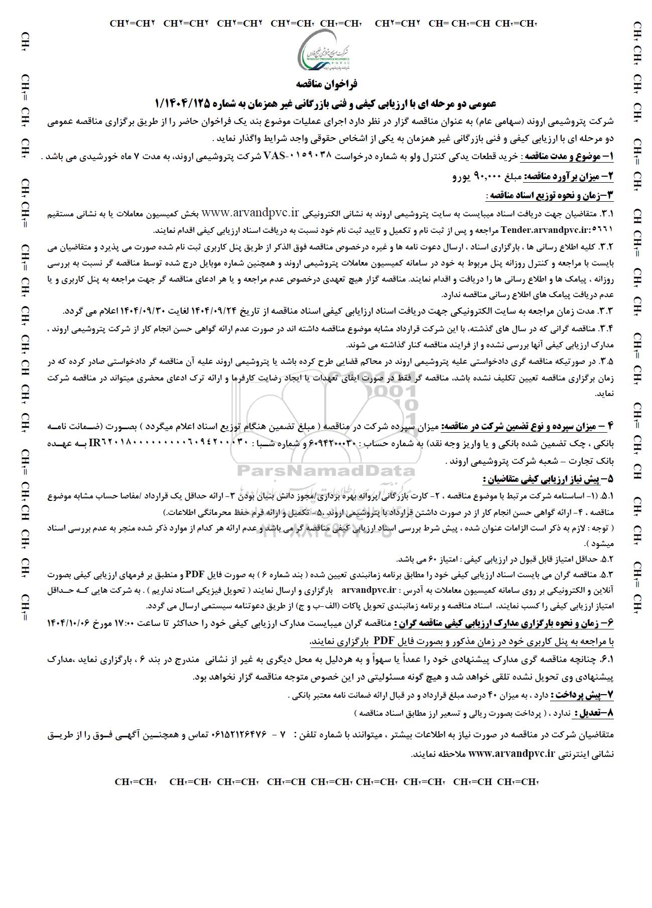 1- موضوع و مدت مناقصه : خرید قطعات یدکی کنترل ولو به شماره درخواست 0159038 - VAS شرکت پتروشیمی اروند به مدت 7 ماه خورشیدی می باشد .