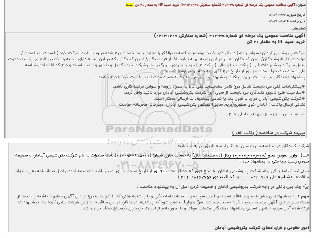 عنوان آگهی مناقصه عمومی یک مرحله ای شماره 35-202 شماره سفارش (22131227) خرید اسید HF به مقدار 20 تن؟