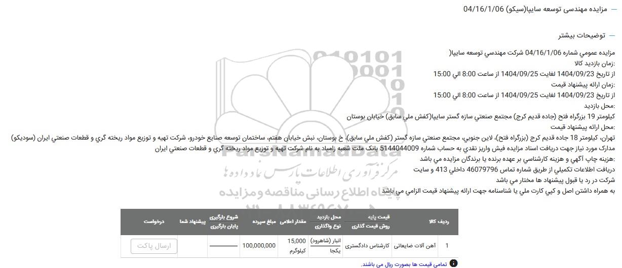 | 1 | آهن الات ضایعاتی | 15.000کیلوگرم | 100.000.000 |