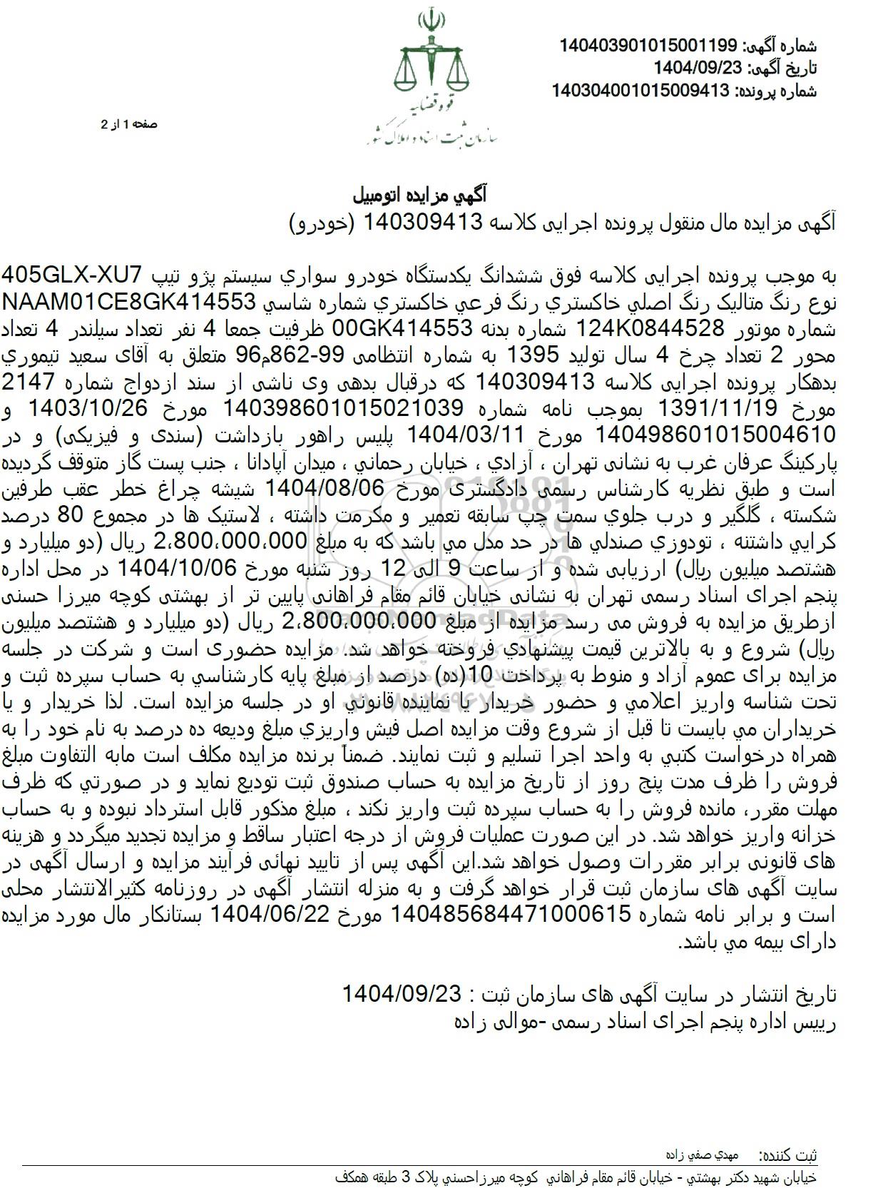 آگهی مزایده مال منقول پرونده اجرایی کلاسه 140309413 (خودرو)