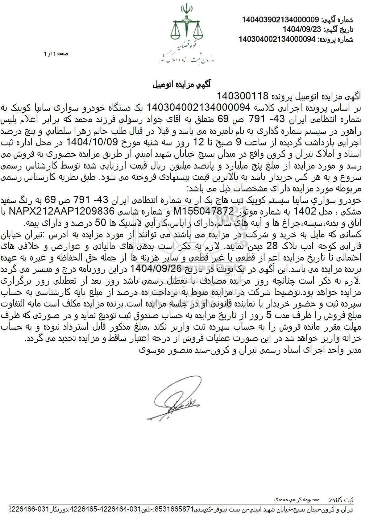 بر اساس پرونده اجرایی کلاسه 140304002134000094 یک دستگاه خودرو سواری سایپا کوییک به شماره انتظامی ایران -79143 ص 69 متعلق به آقای جواد رسولی فرزند محمد که برابر اعلام پلیس راهور در سیستم شماره گذاری به نام نامبرده میباشد و قبلا در قبال طلب خانم زهرا سلطاني و پنج درصد اجرایی بازداشت گردیده از ساعت 9 صبح تا 12 روز سه شنبه مورخ 1404.10.09 در محل اداره ثبت اسناد و املاک تیران و کرون واقع در میدان بسیج خیابان شهید امینی از طریق مزایده حضوری به فروش می رسد و مورد مزایده از مبلغ پنج میلیارد و پانصد میلیون ریال قیمت ارزیابی شده توسط کارشناس رسمی شروع و به هر کس خریدار باشد به بالاترین قیمت پیشنهادی فروخته میشود. طبق نظریه کارشناس رسمی مربوطه مورد مزایده دارای مشخصات ذیل می باشد.