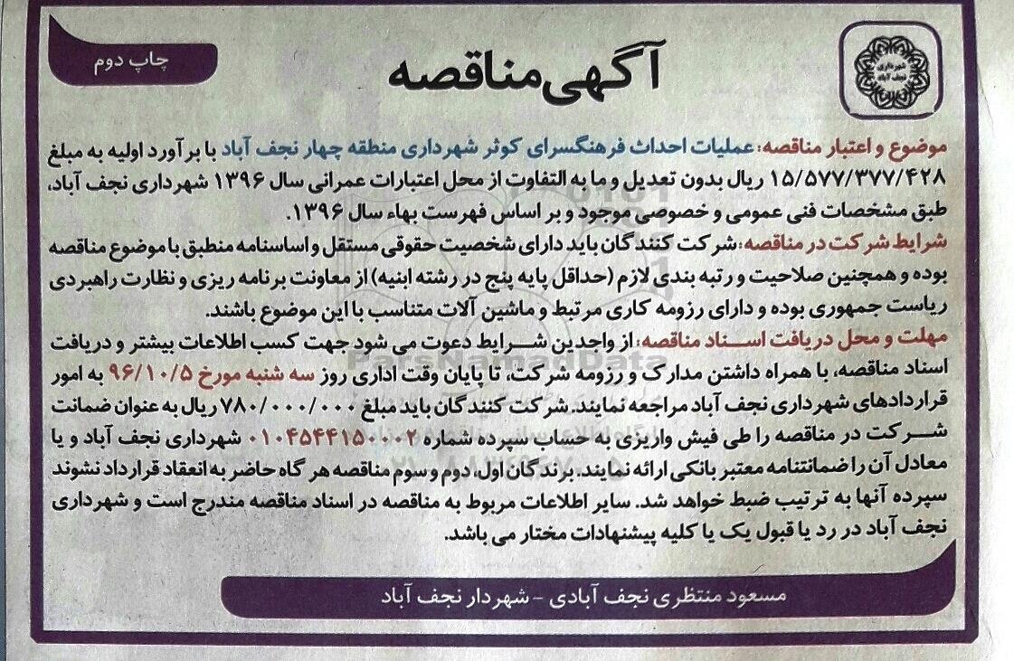 موضوع و اعتبار مناقصه: عملیات احداث فرهنگسرای کوثر شهرداری منطقه چهار نجف آباد با برآورد اولیه به مبلغ 15.577.377.428 ریال بدون تعدیل و ما به التفاوت، از محل اعتبارات عمرانی سال 1396 شهرداری نجف آباد طبق مشخصات فنی عمومی و خصوصی موجود و بر اساس فهرست بهای سال 1396