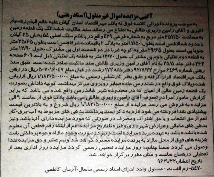 مزایده ششدانگ زمین مساحت 657.50متر غیرمنقول