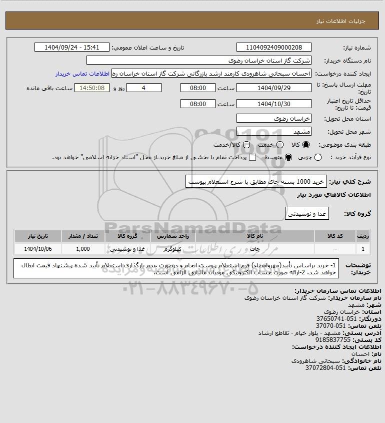 شرح کلی نیاز: خرید 1000 بسته چای مطابق با شرح استعلام پیوست