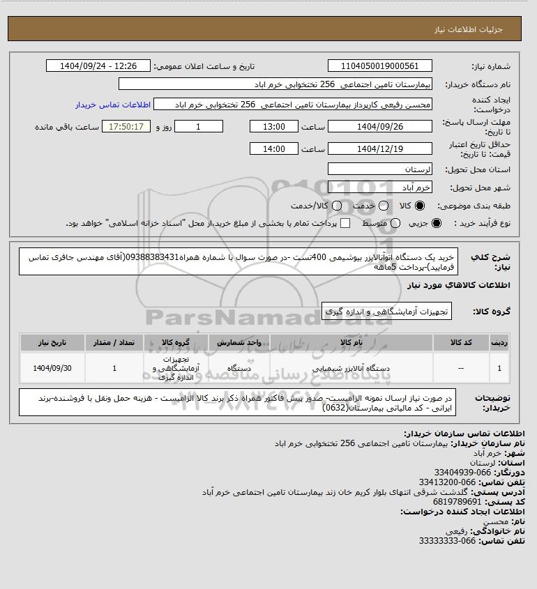 شرح کلی نیاز: خرید یک دستگاه اتوآنالایزر بیوشیمی 400تست -در صورت سوال با شماره همراه09388383431(آقای مهندس جافری تماس فرمایید)-پرداخت 5ماهه