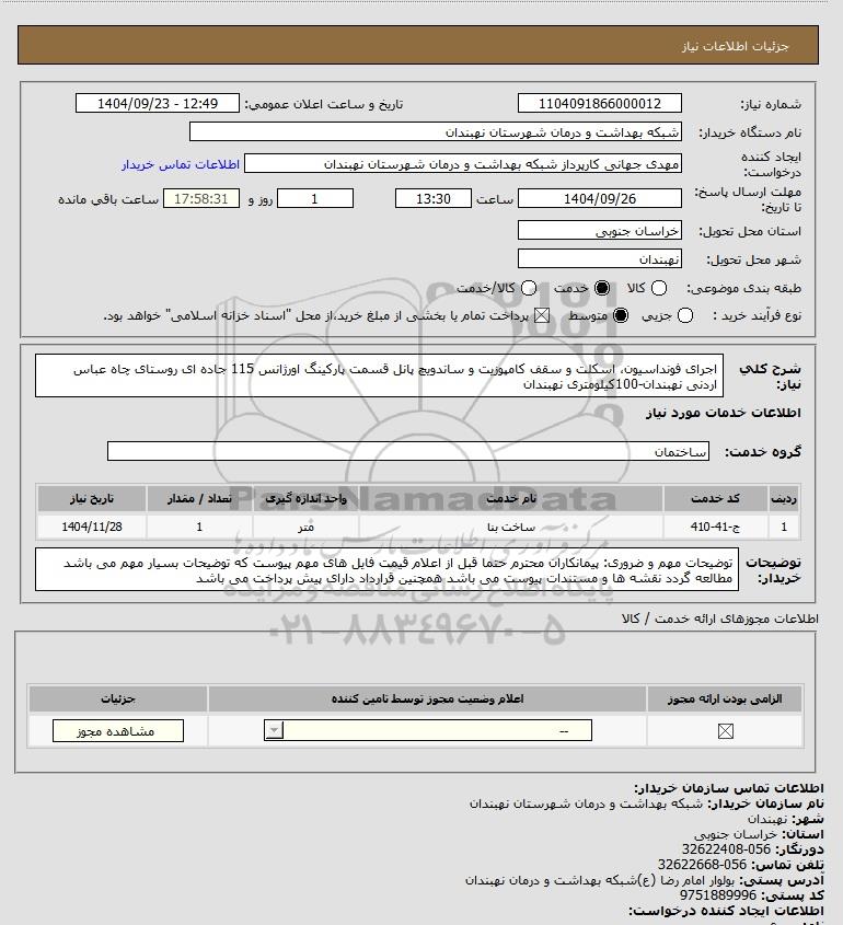شرح کلی نیاز: اجرای فونداسیون، اسکلت و سقف کامپوزیت و ساندویچ پانل قسمت پارکینگ اورژانس 115 جاده ای روستای چاه عباس اردنی نهبندان-100کیلومتری نهبندان