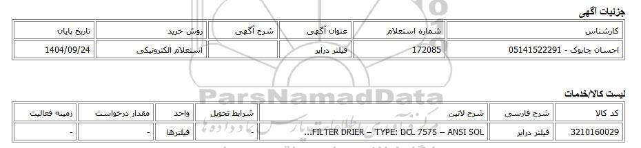 | احسان چابوک - 05141522291 | 172085 | فیلتر درایر | استعلام الکترونیکی | 1404/09/24 |