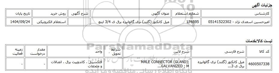 استعلام الکترونیکی میل کانکتور (گلند) نری گالوانیزه برق ی 3/4 اینچ, استعلام الکترونیکی، میل کانکتور (گلند) نری گالوانیزه برق ی 3/4 اینچ