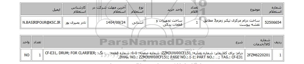 | 52506654 | ساخت درام مرکزی تیکنر زمزم3 مطابق نقشه پیوست | 1 | ساخت تجهیزات و قطعات یدکی | استانی | 1404/09/24 | نادر بصیری پور | N.BASIRIPOUR@KSC.IR |