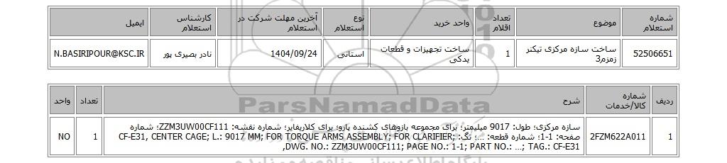 | 52506651 | ساخت سازه مرکزی تیکنر زمزم3 | 1 | ساخت تجهیزات و قطعات یدکی | استانی | 1404/09/24 | نادر بصیری پور | N.BASIRIPOUR@KSC.IR |