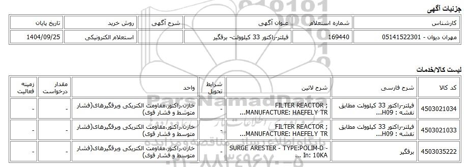 | مهران دیوان - 05141522301 | 169440 | فیلتر-راکتور 33 کیلوولت- برقگیر | استعلام الکترونیکی | 1404/09/25 |