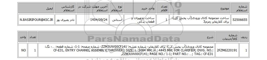 52506655ساخت مجموعه کانال ورودی(آب پخش کن)؛ برای کلاریفایر زمزم31ساخت تجهیزات و قطعات یدکیاستانی1404/09/24نادر بصیری پورN.BASIRIPOUR@KSC.IR