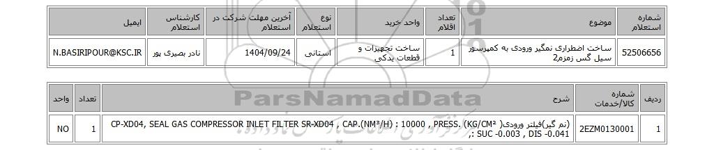 | 52506656 | ساخت اضطراری نمگیر ورودی به کمپرسور سیل گس زمزم2 | 1 | ساخت تجهیزات و قطعات یدکی | استانی | 1404/09/24 | نادر بصیری پور | N.BASIRIPOUR@KSC.IR |