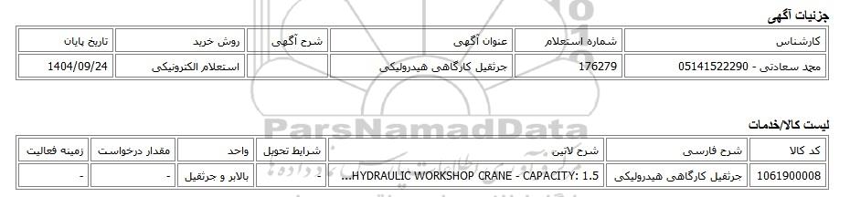 | محمد سعادتی - 05141522290 | 176279 | جرثقیل کارگاهی هیدرولیکی | استعلام الکترونیکی | 1404/09/24 |