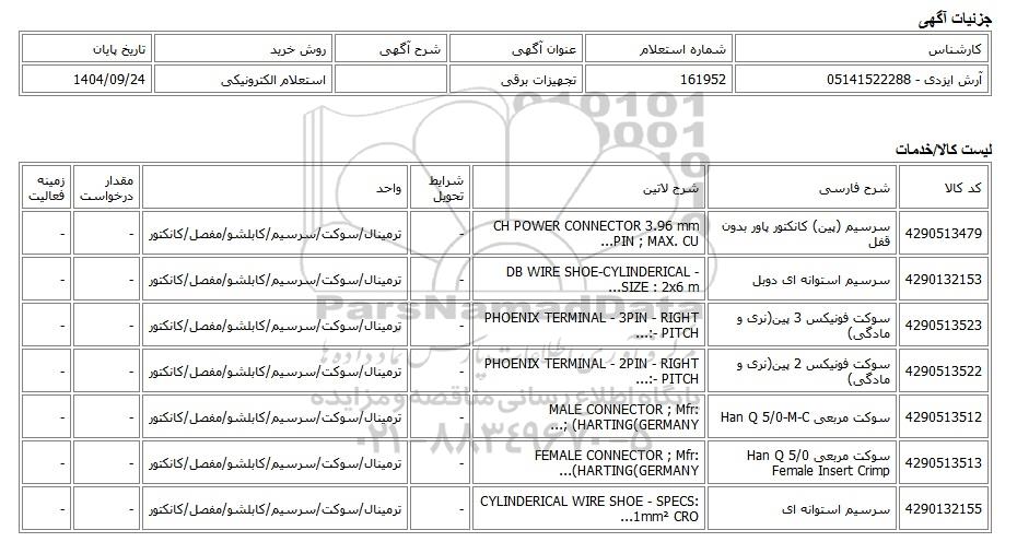 | آرش ایزدی - 05141522288 | 161952 | تجهیزات برقی | استعلام الکترونیکی | 1404/09/24 |