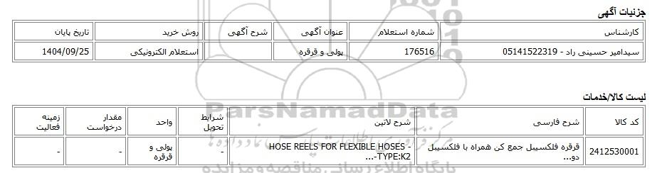 | سیدامیر حسینی راد - 05141522319 | 176516 | پولی و قرقره | استعلام الکترونیکی | 1404/09/25 |