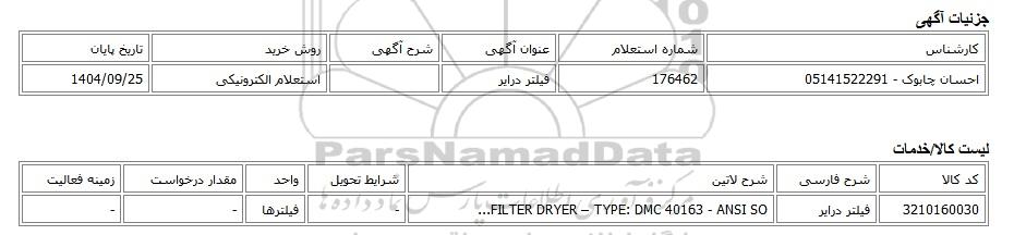 | احسان چابوک - 05141522291 | 176462 | فیلتر درایر | استعلام الکترونیکی | 1404/09/25 |