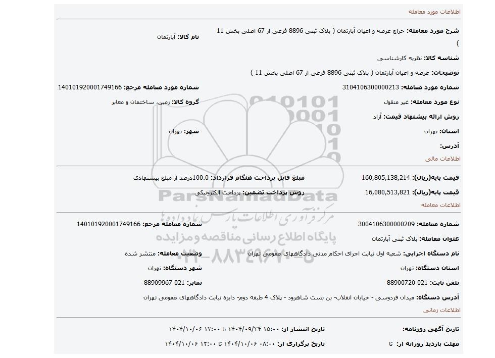مزایده عرصه و اعیان آپارتمان ( پلاک ثبتی 8896 فرعی از 67 اصلی بخش 11 ), مزایده، عرصه و اعیان آپارتمان ( پلاک ثبتی 8896 فرعی از 67 اصلی بخش 11 )
