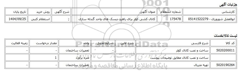 | ابوالفضل شورورزی - 05141522279 | 175478 | کانال کشی کولر برای راهرو دیسک های واحد گندله سازی | ; | استعلام کتبی | 1404/09/25 |