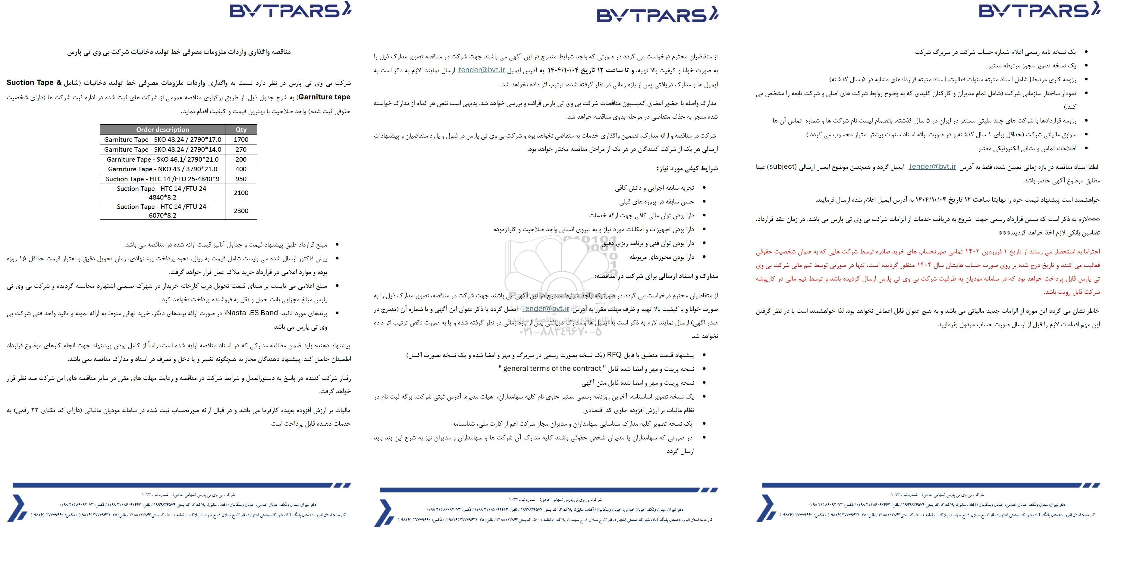 شرکت بی وی تی پارس در نظر دارد نسبت به واگذاری واردات ملزومات مصرفی خط تولید دخانیات (شامل Suction Tape & Garniture tape) به شرح جدول ذیل، از طریق برگزاری مناقصه عمومی از شرکت های ثبت شده در اداره ثبت شرکت ها (دارای شخصیت حقوقی ثبت شده) واجد صلاحیت با بهترین قیمت و کیفیت اقدام نماید.