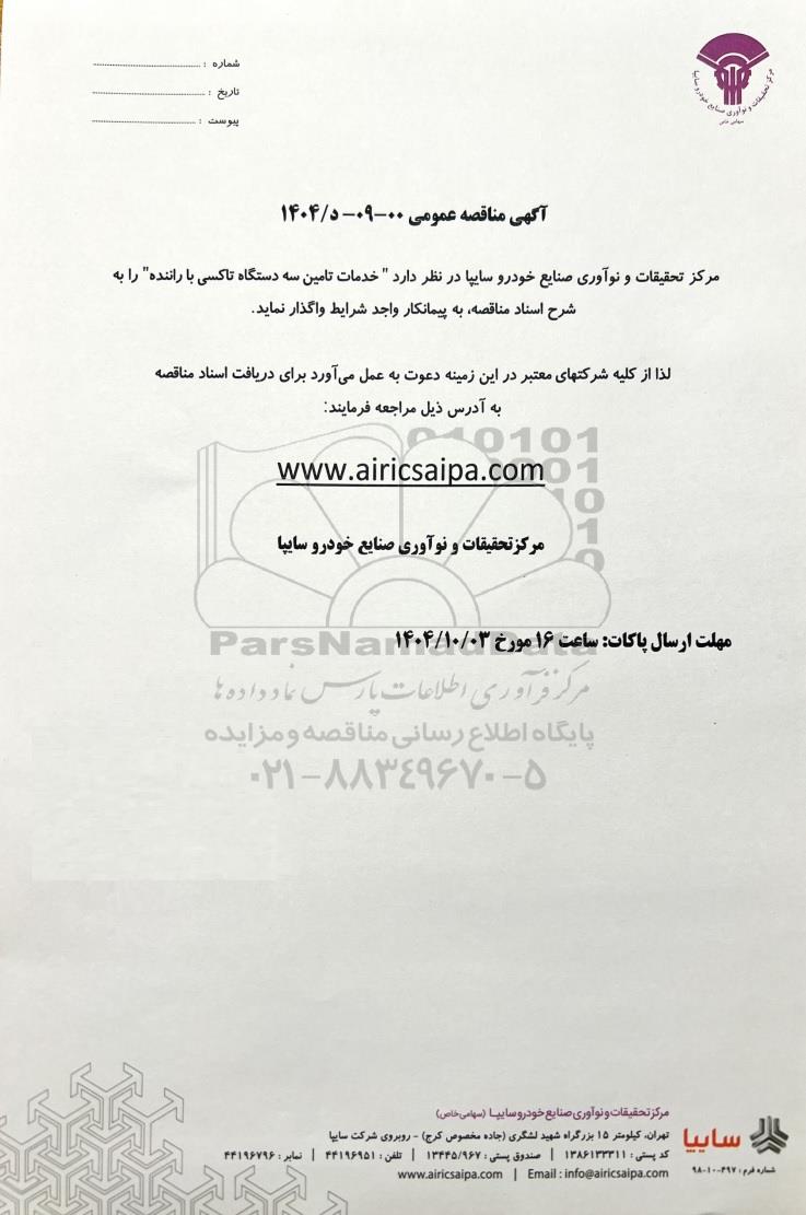 مرکز تحقیقات و نوآوری صنایع خودرو سایپا در نظر دارد "خدمات تامین سه دستگاه تاکسی با راننده" را به شرح اسناد مناقصه، به پیمانکار واجد شرایط واگذار نماید.