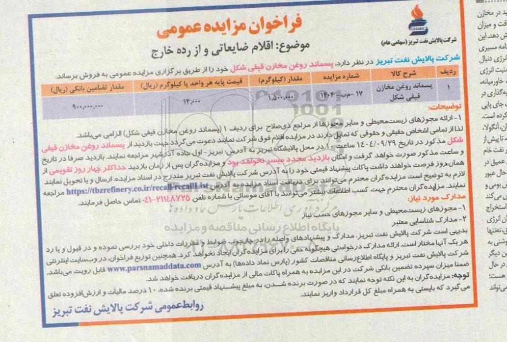 شرکت پالایش نفت تبریز در نظر دارد پسماند روغن مخازن قیفی شکل خود را از طریق برگزاری مزایده عمومی به فروش برساند.
