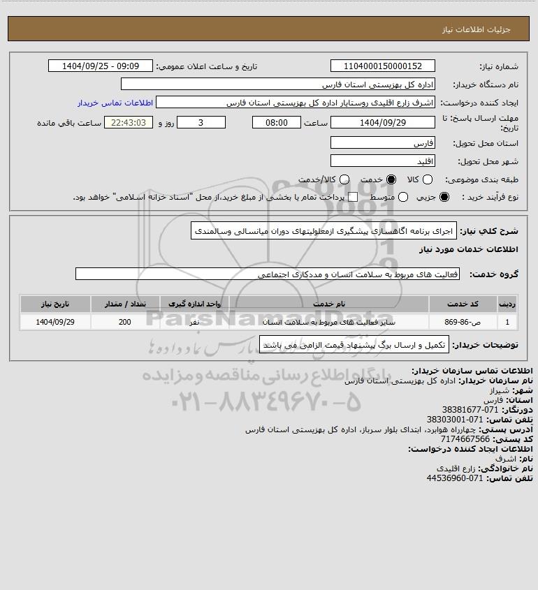 شرح کلی نیاز: اجرای برنامه اگاهسازی پیشگیری ازمعلولیتهای دوران میانسالی وسالمندی