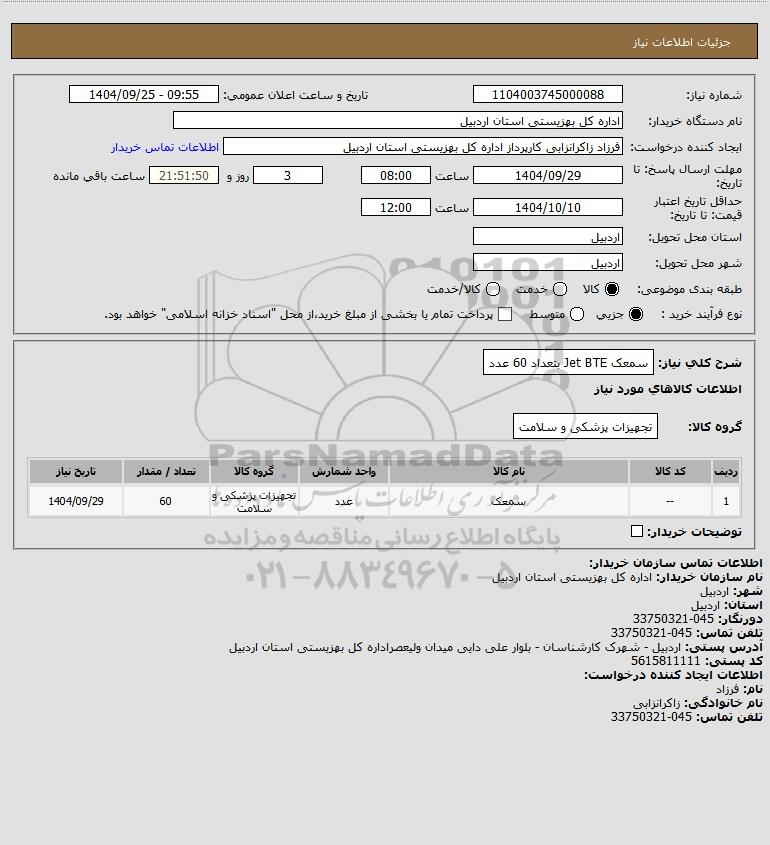 شرح کلی نیاز: سمعک Jet BTE بتعداد 60 عدد
