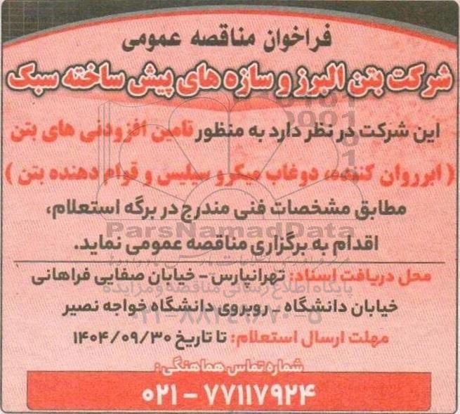 شرکت بتن البرز و سازه های پیش ساخته سبک در نظر دارد به منظور تامین افزودنی های بتن (ابرروان کننده ، دوغاب میکرو سیلیس و قوام دهنده بتن) مطابق مشخصات فنی مندرج در برگه استعلام اقدام به برگزاری مناقصه عمومی نماید.