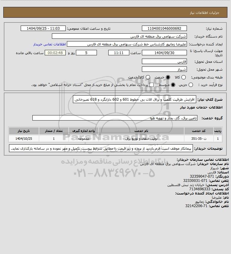 شرح کلی نیاز: افزایش ظرفیت کلمپ و یراق الات بی خطوط 601 و 602 دارابگرد و 618 نصیرخانی